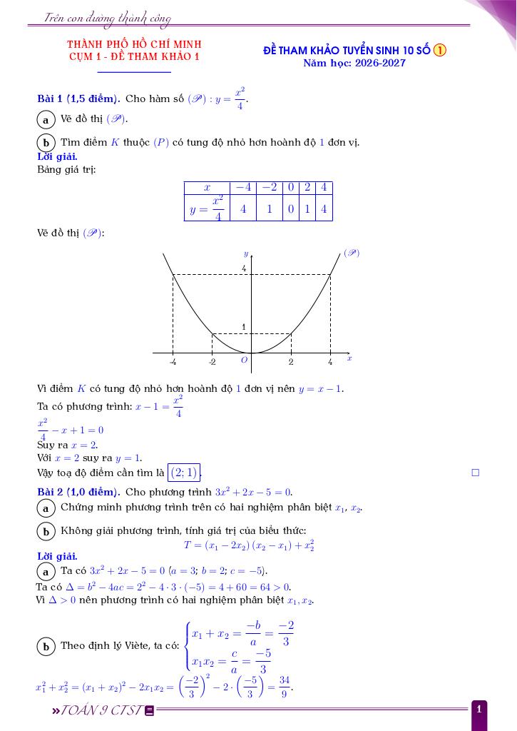 MonToan.com.vn giới thiệu đến quý thầy, cô giáo và các em học sinh đáp án và lời giải chi tiết bộ đề tham khảo kỳ thi tuyển sinh vào lớp 10 THPT môn Toán năm học 2026 – 2027 sở Giáo dục và Đào tạo thành phố Hồ Chí Minh.
