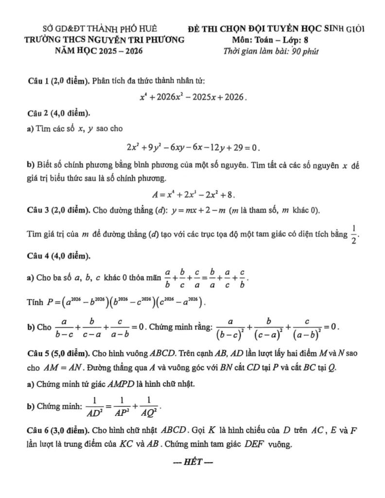 Trích dẫn Đề chọn đội tuyển HSG Toán 8 năm 2025 – 2026 trường THCS Nguyễn Tri Phương – Huế: