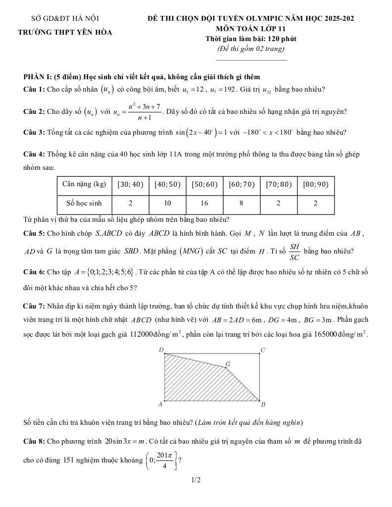 Trích dẫn Đề chọn đội tuyển Olympic Toán 11 năm 2025 – 2026 trường THPT Yên Hòa – Hà Nội: