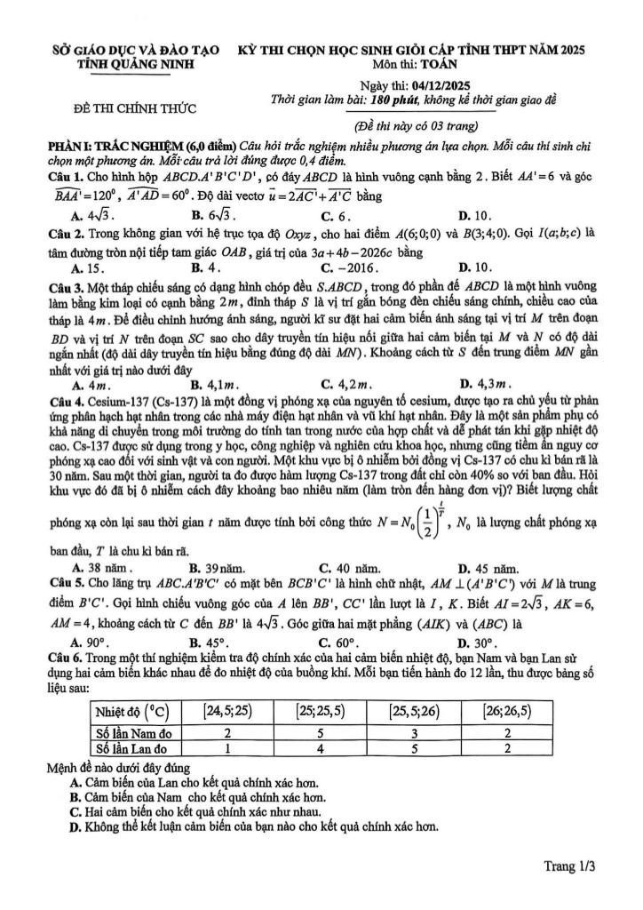 Trích dẫn Đề chọn học sinh giỏi cấp tỉnh môn Toán THPT năm 2025 sở GD&ĐT Quảng Ninh: