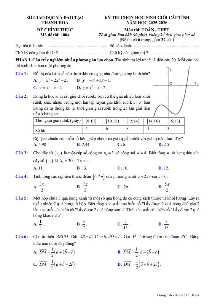 MonToan.com.vn giới thiệu đến quý thầy, cô giáo và các em học sinh đề thi chọn học sinh giỏi cấp tỉnh môn Toán THPT năm học 2025 – 2026 sở Giáo dục và Đào tạo tỉnh Thanh Hóa. Đề thi gồm 20 câu trắc nghiệm nhiều phương án lựa chọn + 06 câu trắc nghiệm đúng sai + 06 câu trắc nghiệm trả lời ngắn, thời gian làm bài 90 phút.