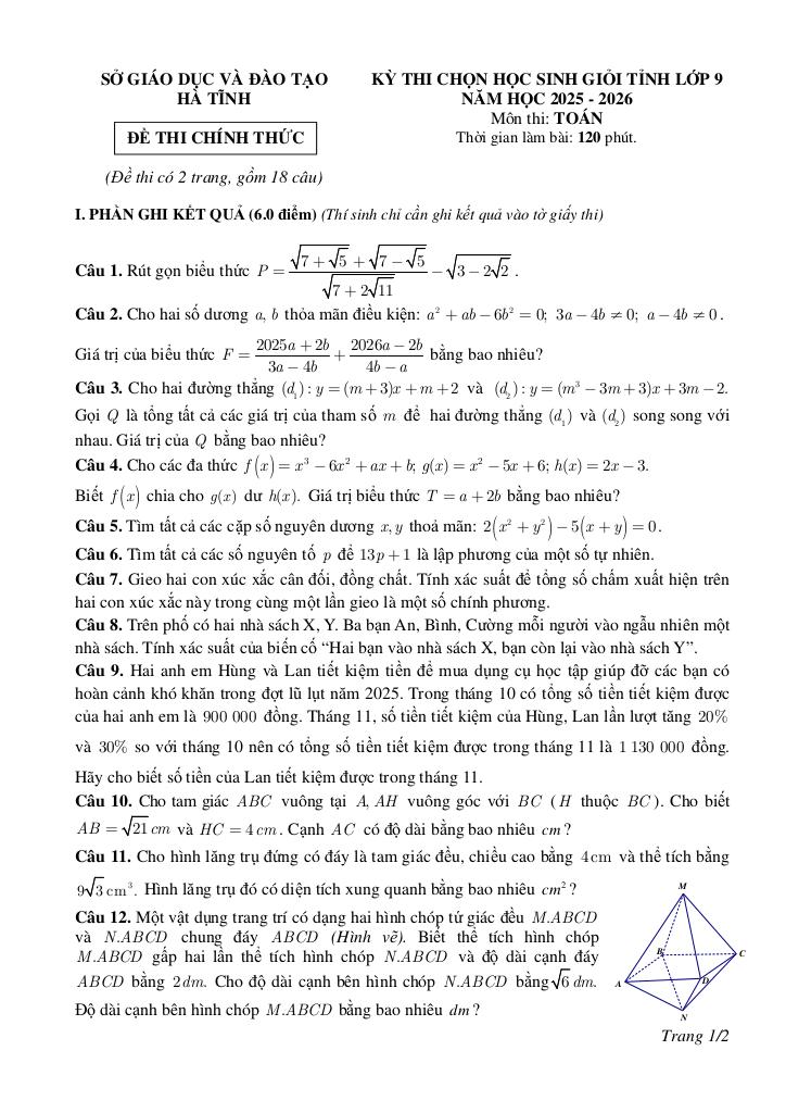 Trích dẫn Đề chọn học sinh giỏi tỉnh Toán 9 năm 2025 – 2026 sở GD&ĐT Hà Tĩnh: