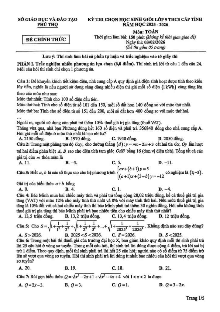 Trích dẫn Đề chọn học sinh giỏi tỉnh Toán 9 năm 2025 – 2026 sở GD&ĐT Phú Thọ: