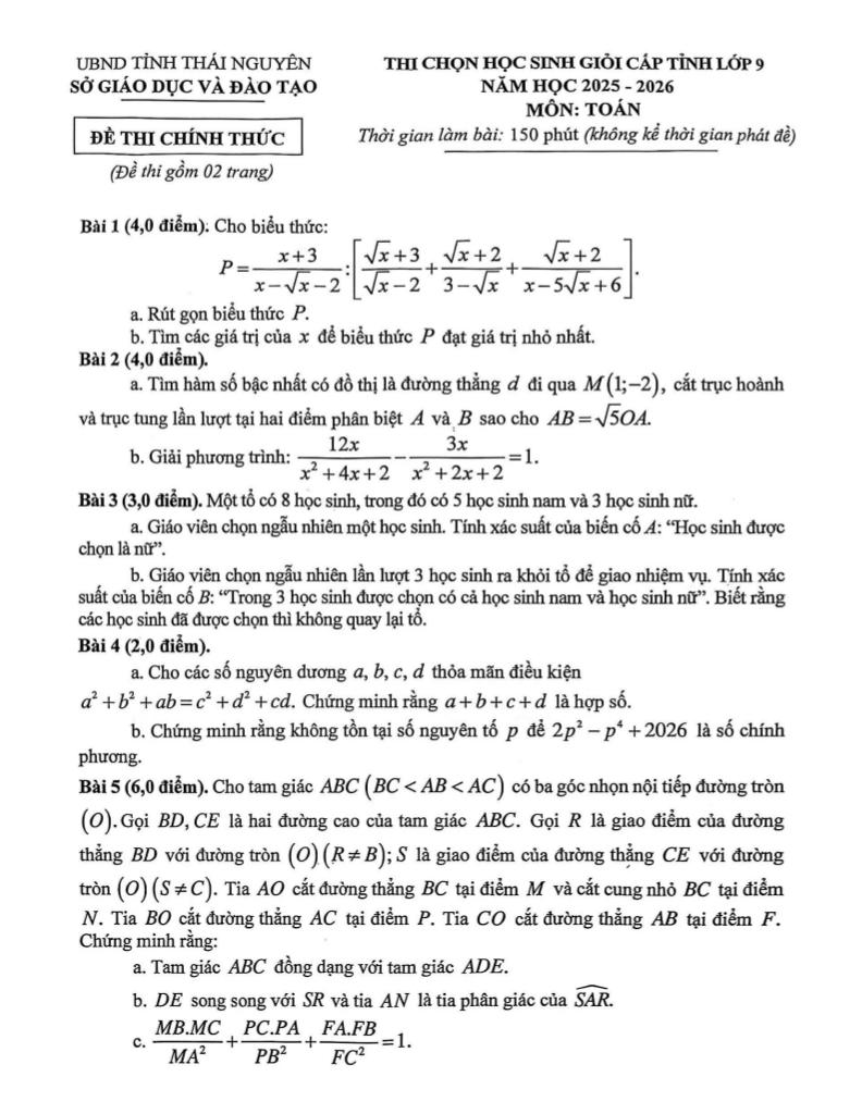 Trích dẫn Đề chọn học sinh giỏi tỉnh Toán 9 năm 2025 – 2026 sở GD&ĐT Thái Nguyên: