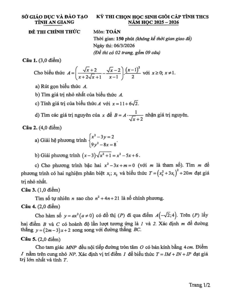 MonToan.com.vn giới thiệu đến quý thầy, cô giáo và các em học sinh đề thi chọn học sinh giỏi cấp tỉnh môn Toán THCS năm học 2025 – 2026 sở Giáo dục và Đào tạo tỉnh An Giang. Kỳ thi được diễn ra vào ngày 06 tháng 03 năm 2026.