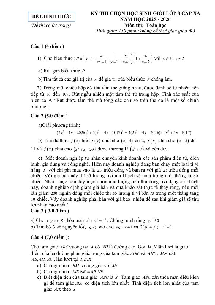 Trích dẫn Đề chọn học sinh giỏi Toán 8 năm 2025 – 2026 cụm các trường THCS – Nghệ An: