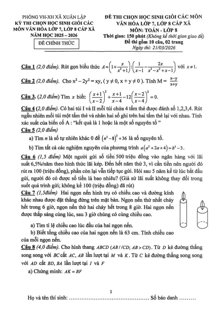 MonToan.com.vn giới thiệu đến quý thầy, cô giáo và các em học sinh đề thi chọn học sinh giỏi văn hóa cấp xã môn Toán 8 năm học 2025 – 2026 xã Xuân Lập, tỉnh Thanh Hóa. Kỳ thi được diễn ra vào ngày 21 tháng 03 năm 2026.
