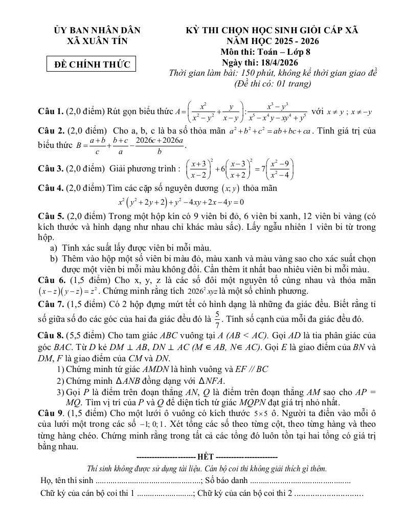 Trích dẫn Đề chọn học sinh giỏi Toán 8 năm 2025 – 2026 xã Xuân Tín – Thanh Hóa: