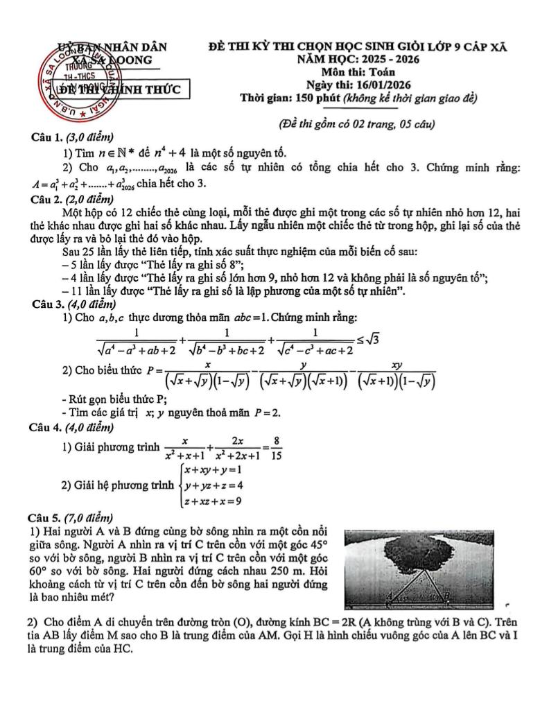 Trích dẫn Đề chọn học sinh giỏi Toán 9 cấp xã năm 2025 – 2026 xã Sa Loong – Quảng Ngãi: