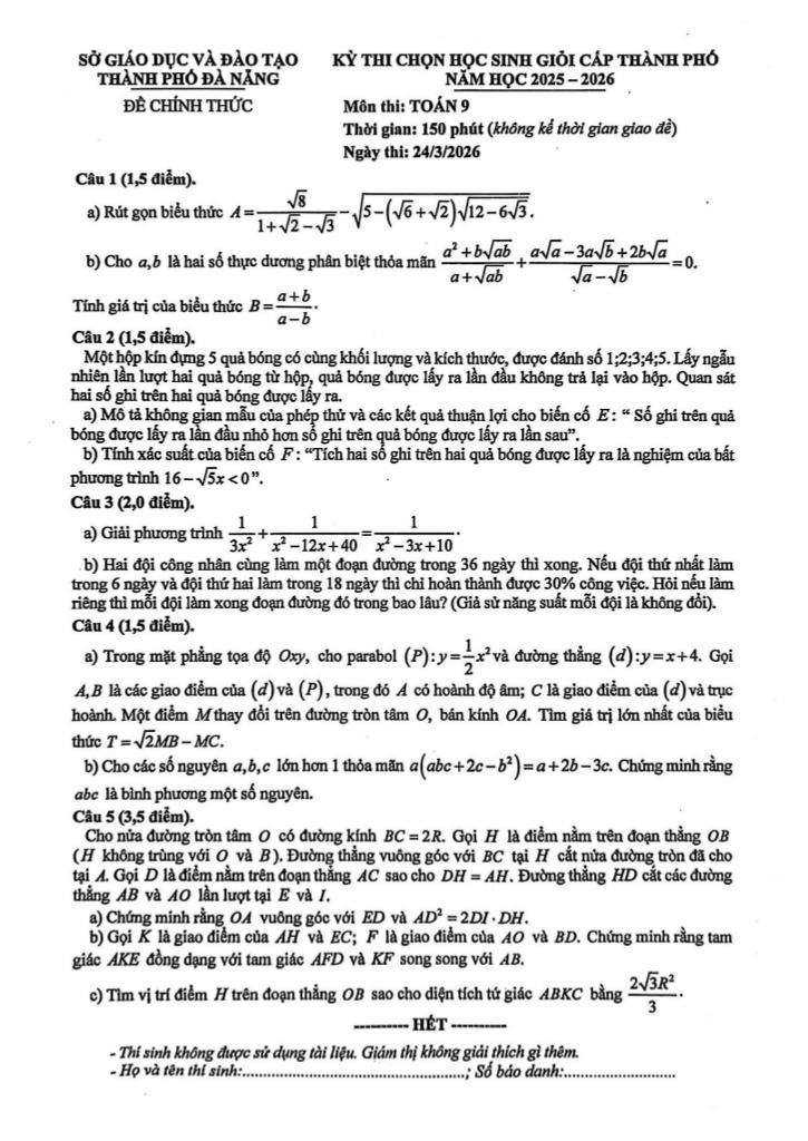 MonToan.com.vn giới thiệu đến quý thầy, cô giáo và các em học sinh đề thi chọn học sinh giỏi cấp thành phố môn Toán 9 năm học 2025 – 2026 sở Giáo dục và Đào tạo thành phố Đà Nẵng. Kỳ thi được diễn ra vào ngày 24 tháng 03 năm 2026. Đề thi có đáp án và lời giải chi tiết.