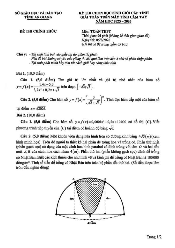 MonToan.com.vn giới thiệu đến quý thầy, cô giáo và các em học sinh đề thi chọn học sinh giỏi cấp tỉnh giải Toán THPT trên máy tính cầm tay năm học 2025 – 2026 sở Giáo dục và Đào tạo tỉnh An Giang. Kỳ thi được diễn ra vào ngày 06 tháng 03 năm 2026. Đề thi có đáp án và lời giải chi tiết.