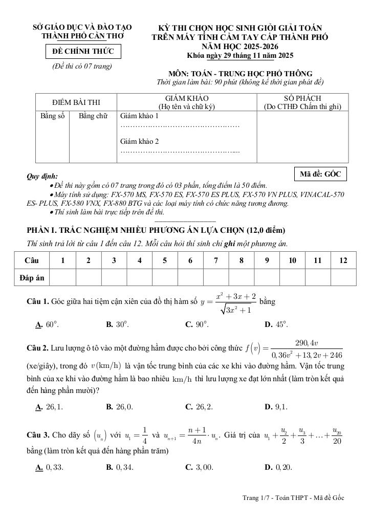 MonToan.com.vn giới thiệu đến quý thầy, cô giáo và các em học sinh đề thi chọn học sinh giỏi giải toán THPT trên máy tính cầm tay cấp thành phố năm học 2025 – 2026 sở Giáo dục và Đào tạo thành phố Cần Thơ. Kỳ thi được diễn ra vào ngày 29 tháng 11 năm 2025.