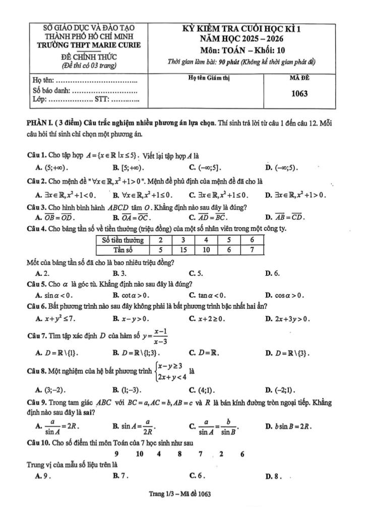 Trích dẫn Đề cuối học kì 1 Toán 10 năm 2025 – 2026 trường THPT Marie Curie – TP HCM: