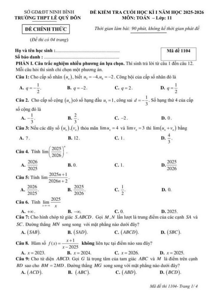 Trích dẫn Đề cuối học kì 1 Toán 11 năm 2025 – 2026 trường THPT Lê Quý Đôn – Ninh Bình: