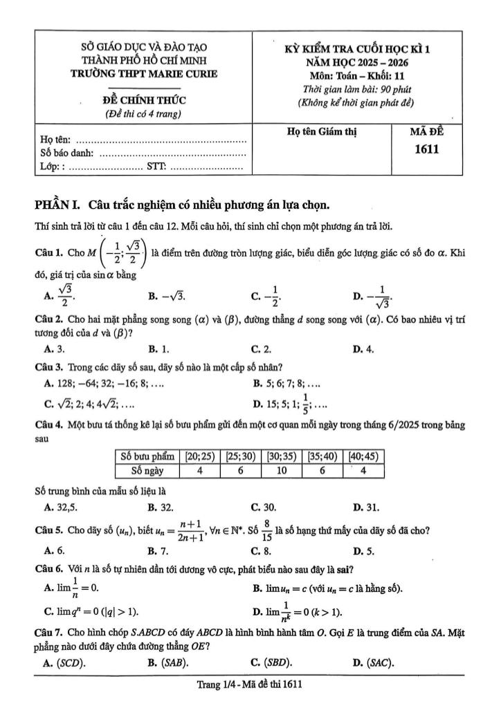 Trích dẫn Đề cuối học kì 1 Toán 11 năm 2025 – 2026 trường THPT Marie Curie – TP HCM: