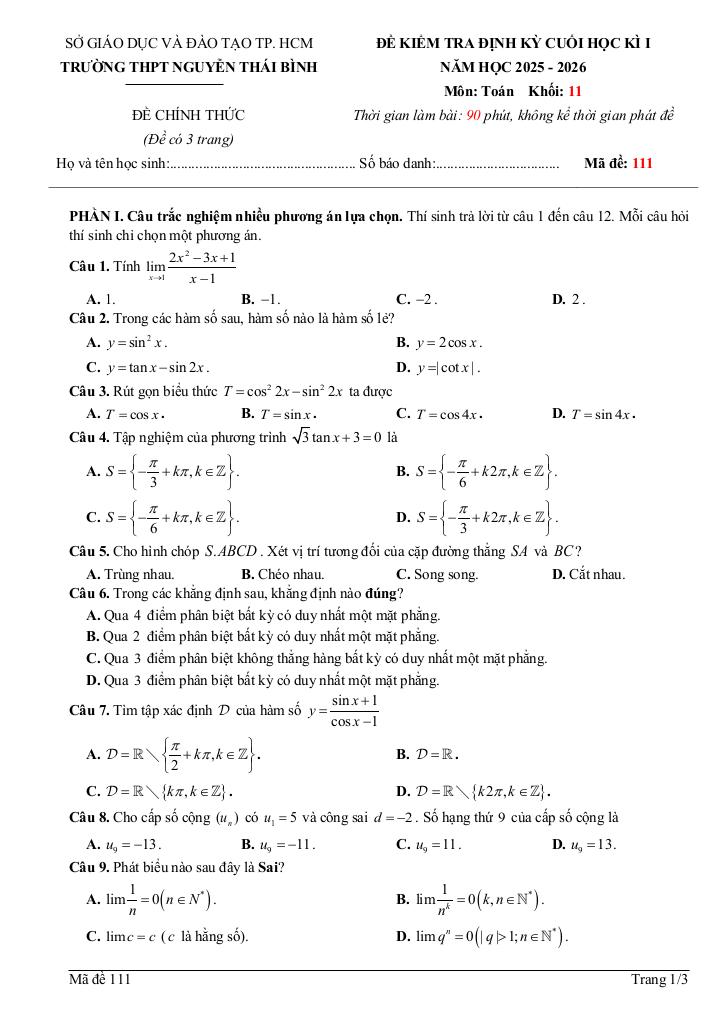 MonToan.com.vn giới thiệu đến quý thầy, cô giáo và các em học sinh đề kiểm tra định kỳ cuối học kì 1 môn Toán 11 năm học 2025 – 2026 trường THPT Nguyễn Thái Bình, thành phố Hồ Chí Minh. Đề thi gồm 12 câu trắc nghiệm nhiều phương án lựa chọn + 02 câu trắc nghiệm đúng sai + 04 câu trắc nghiệm trả lời ngắn + 03 câu tự luận, thời gian làm bài 90 phút.