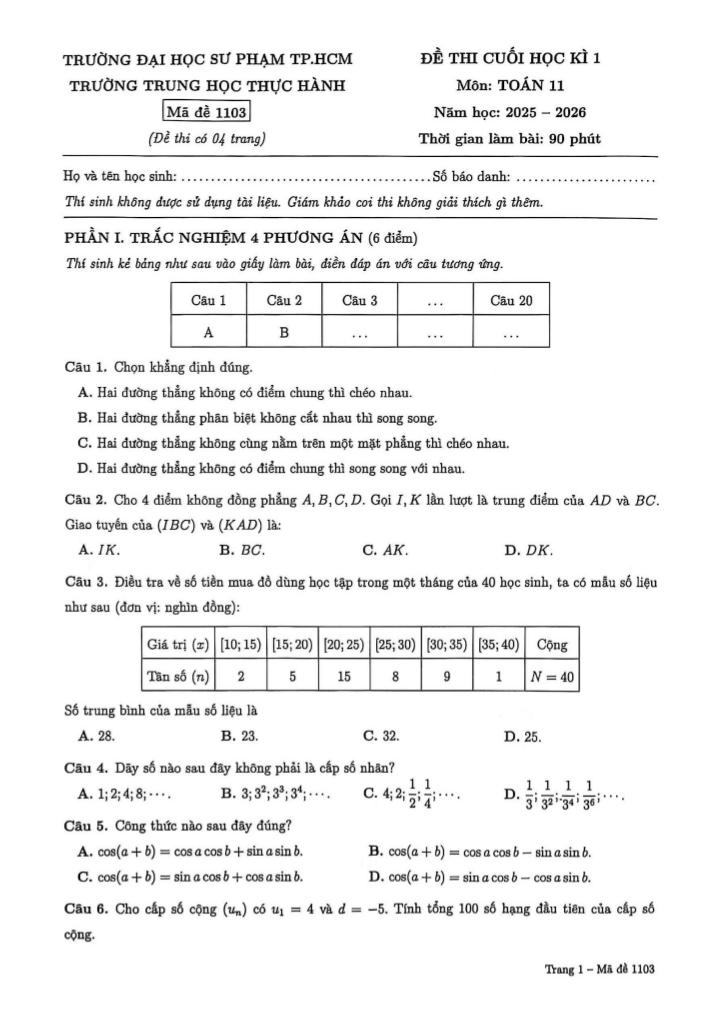 Trích dẫn Đề cuối học kì 1 Toán 11 năm 2025 – 2026 trường Trung học Thực hành ĐHSP – TP HCM: