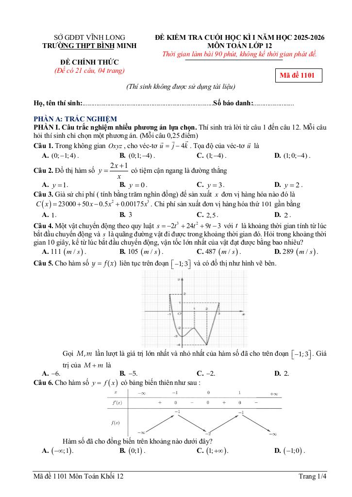 Trích dẫn Đề cuối học kì 1 Toán 12 năm 2025 – 2026 trường THPT Bình Minh – Vĩnh Long: