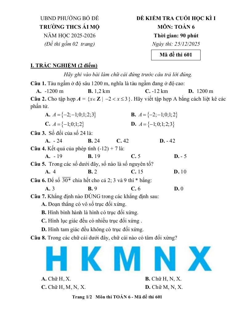 Trích dẫn Đề cuối học kì 1 Toán 6 năm 2025 – 2026 trường THCS Ái Mộ – Hà Nội: