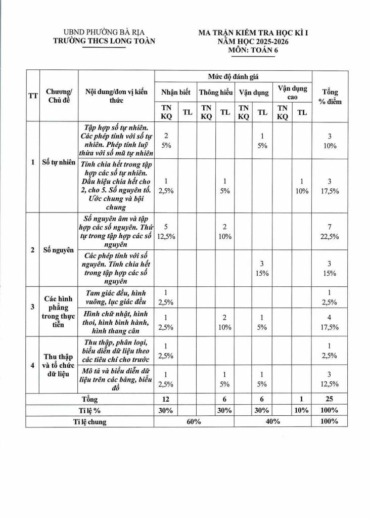 MonToan.com.vn giới thiệu đến quý thầy, cô giáo và các em học sinh đề kiểm tra cuối học kì 1 môn Toán 6 năm học 2025 – 2026 trường THCS Long Toàn, phường Bà Rịa, thành phố Hồ Chí Minh. Kỳ thi được diễn ra vào ngày 23 tháng 12 năm 2025.