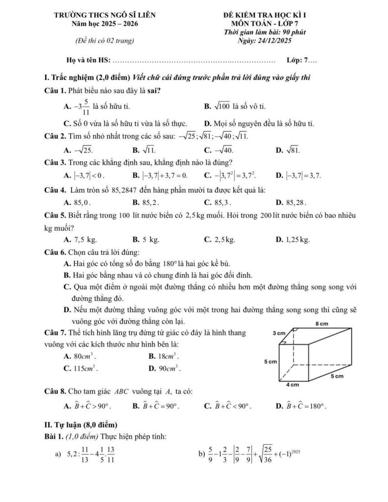 Trích dẫn Đề cuối học kì 1 Toán 7 năm 2025 – 2026 trường THCS Ngô Sĩ Liên – Hà Nội: