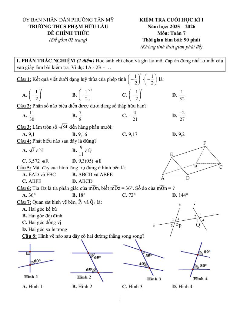 Trích dẫn Đề cuối học kì 1 Toán 7 năm 2025 – 2026 trường THCS Phạm Hữu Lầu – TP HCM: