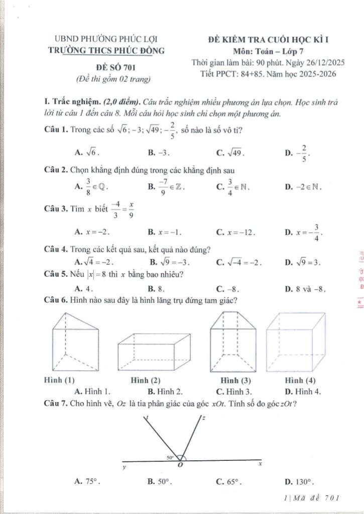 Trích dẫn Đề cuối học kì 1 Toán 7 năm 2025 – 2026 trường THCS Phúc Đồng – Hà Nội: