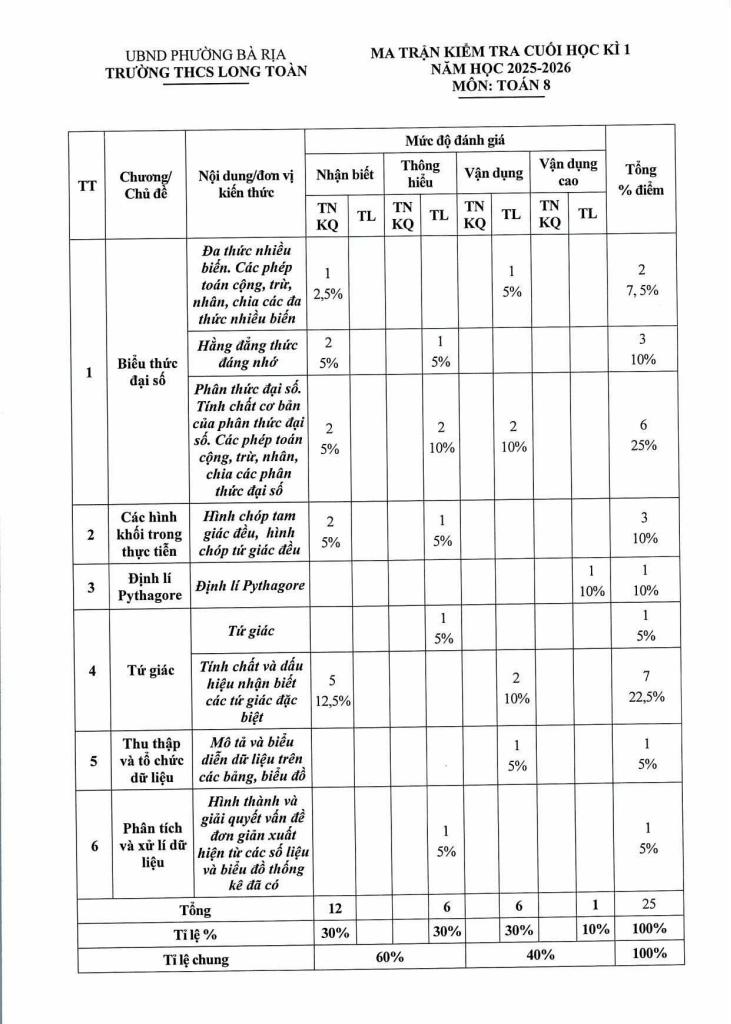 MonToan.com.vn giới thiệu đến quý thầy, cô giáo và các em học sinh đề kiểm tra cuối học kì 1 môn Toán 8 năm học 2025 – 2026 trường THCS Long Toàn, phường Bà Rịa, thành phố Hồ Chí Minh. Kỳ thi được diễn ra vào ngày 23 tháng 12 năm 2025.
