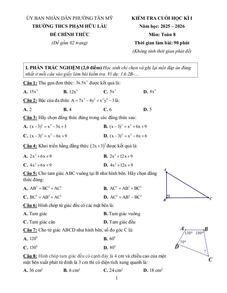 Trích dẫn Đề cuối học kì 1 Toán 8 năm 2025 – 2026 trường THCS Phạm Hữu Lầu – TP HCM: