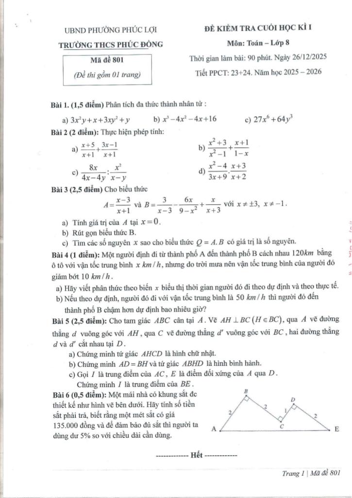 Trích dẫn Đề cuối học kì 1 Toán 8 năm 2025 – 2026 trường THCS Phúc Đồng – Hà Nội:
