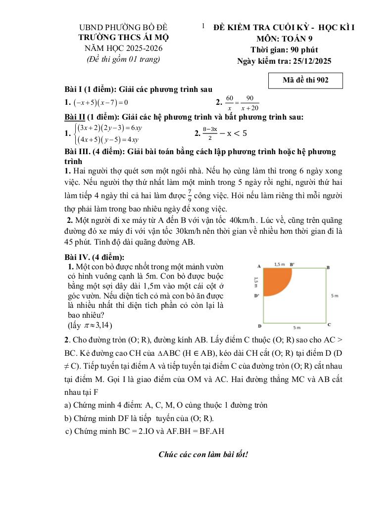 Trích dẫn Đề cuối học kì 1 Toán 9 năm 2025 – 2026 trường THCS Ái Mộ – Hà Nội: