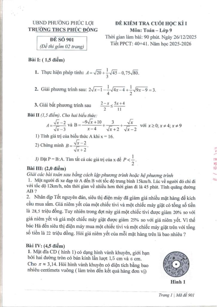 Trích dẫn Đề cuối học kì 1 Toán 9 năm 2025 – 2026 trường THCS Phúc Đồng – Hà Nội: