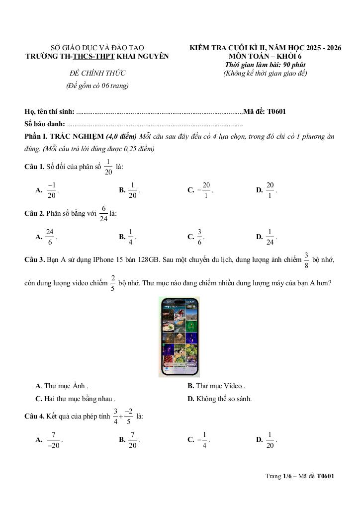 Trích dẫn Đề cuối học kì 2 Toán 6 năm 2025 – 2026 trường Khai Nguyên – TP HCM: