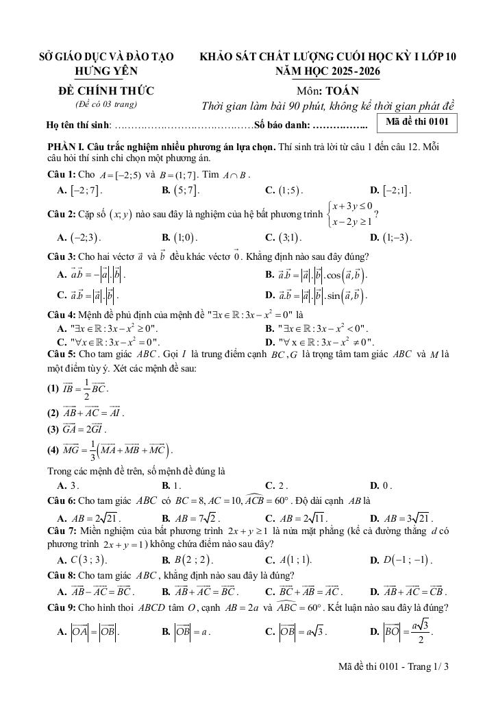 MonToan.com.vn giới thiệu đến quý thầy, cô giáo và các em học sinh đề khảo sát chất lượng cuối học kỳ 1 môn Toán 10 năm học 2025 – 2026 sở Giáo dục và Đào tạo tỉnh Hưng Yên. Đề thi có đáp án mã đề 0101 0103 0105 0107 0102 0104 0106 0108.