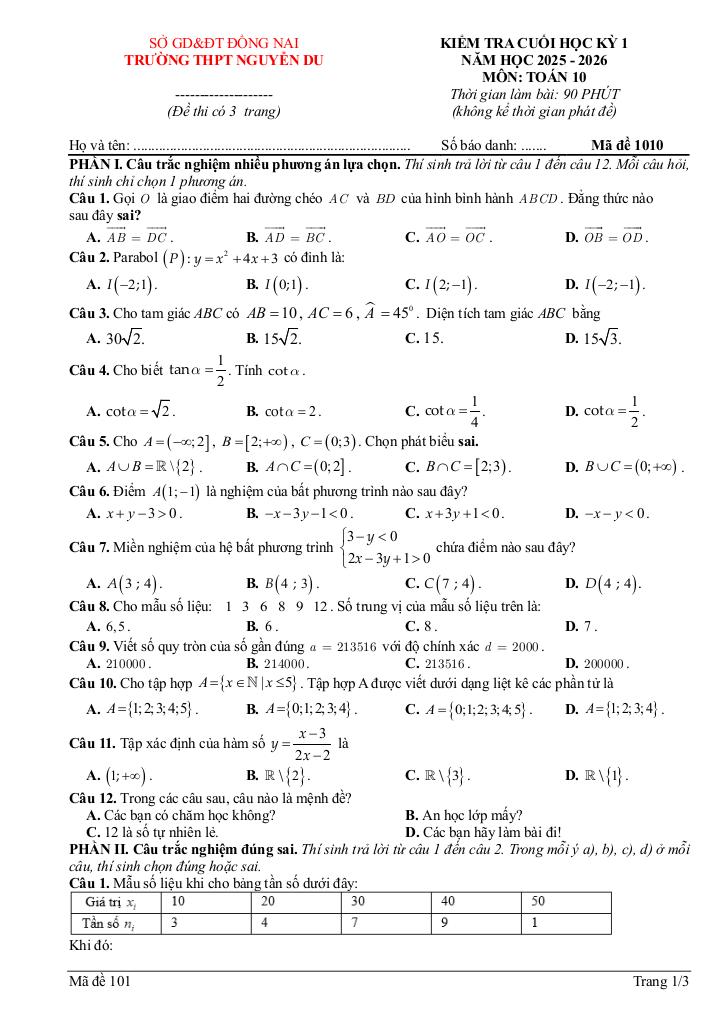 Trích dẫn Đề cuối học kỳ 1 Toán 10 năm 2025 – 2026 trường THPT Nguyễn Du – Đồng Nai: