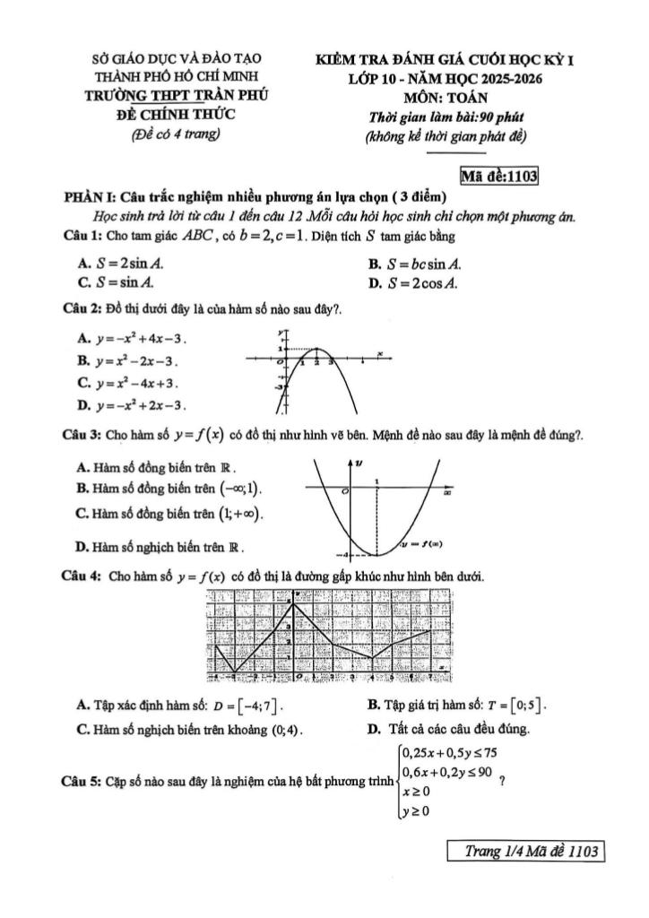 Trích dẫn Đề cuối học kỳ 1 Toán 10 năm 2025 – 2026 trường THPT Trần Phú – TP HCM: