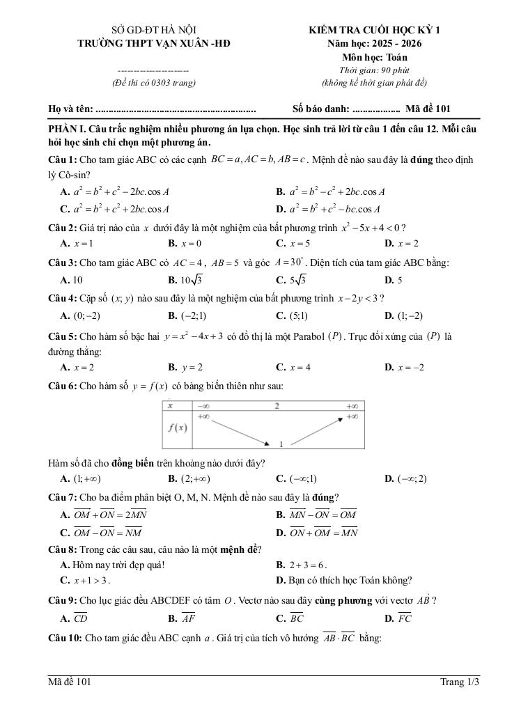 Trích dẫn Đề cuối học kỳ 1 Toán 10 năm 2025 – 2026 trường THPT Vạn Xuân – Hà Nội: