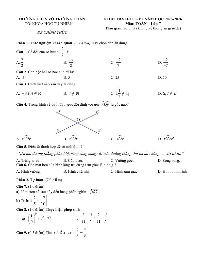 Trích dẫn Đề cuối học kỳ 1 Toán 7 năm 2025 – 2026 trường THCS Võ Trường Toản – TP HCM: