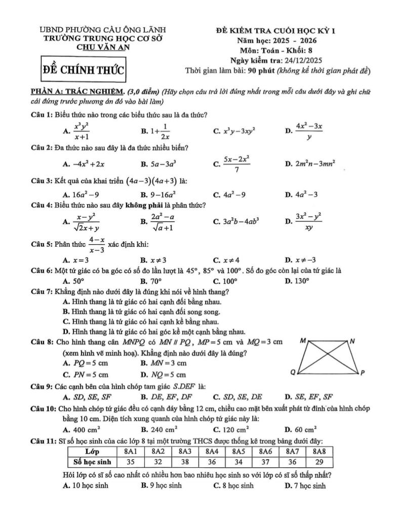Trích dẫn Đề cuối học kỳ 1 Toán 8 năm 2025 – 2026 trường THCS Chu Văn An – TP HCM: