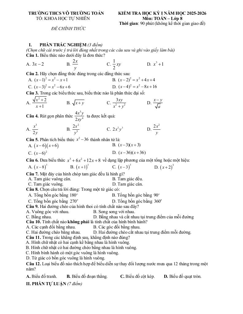 Trích dẫn Đề cuối học kỳ 1 Toán 8 năm 2025 – 2026 trường THCS Võ Trường Toản – TP HCM: