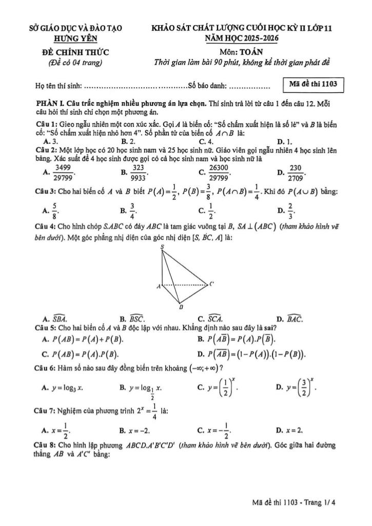 Trích dẫn Đề cuối học kỳ 2 Toán 11 năm 2025 – 2026 sở GD&ĐT Hưng Yên: