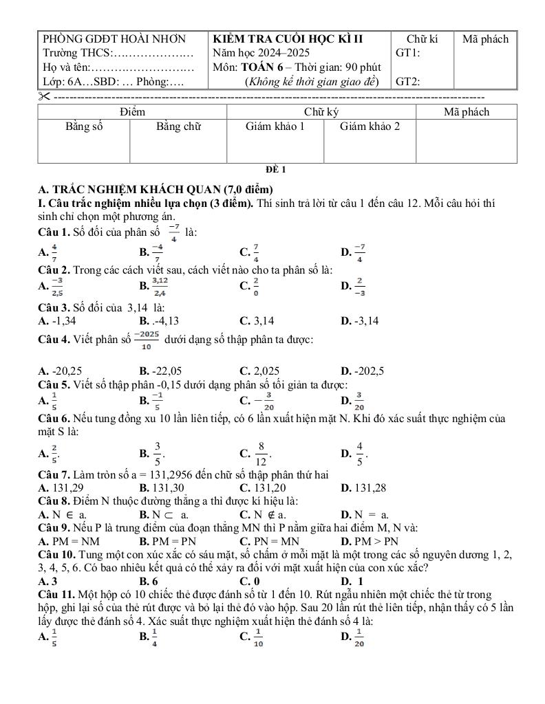 MonToan.com.vn giới thiệu đến quý thầy, cô giáo và các em học sinh lớp 6 đề kiểm tra cuối học kỳ 2 môn Toán 6 năm học 2024 – 2025 phòng Giáo dục và Đào tạo thị xã Hoài Nhơn, tỉnh Bình Định; đề thi có đáp án trắc nghiệm và lời giải chi tiết tự luận.