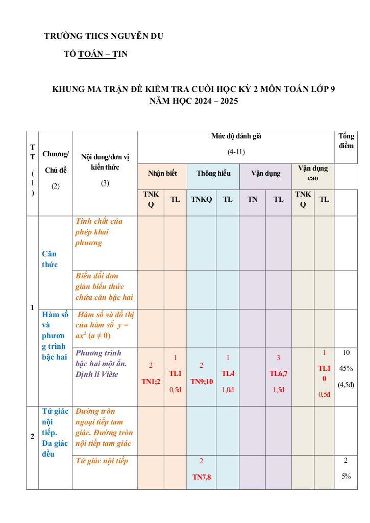 Quý thầy cô và học sinh đang tham khảo đề cuối học kỳ 2 toán 9 năm 2024 – 2025 trường thcs nguyễn du – lâm đồng, bộ đề thi được xây dựng bám sát chuẩn tài liệu toán cập nhật nhất. Cấu trúc đề bảo đảm độ phủ kiến thức đồng đều, mức độ câu hỏi được cân chỉnh từ nhận biết đến vận dụng cao, phù hợp kiểm tra toàn diện năng lực. Hãy khai thác triệt để tài liệu này để đánh giá chính xác trình độ hiện tại và tối ưu chiến lược luyện thi của bạn.