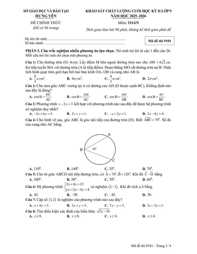 MonToan.com.vn giới thiệu đến quý thầy, cô giáo và các em học sinh đề khảo sát chất lượng cuối học kỳ 2 môn Toán 9 năm học 2025 – 2026 sở Giáo dục và Đào tạo tỉnh Hưng Yên. Đề thi gồm 26 câu trắc nghiệm nhiều phương án lựa chọn + 02 câu trắc nghiệm đúng sai + 06 câu trắc nghiệm trả lời ngắn, thời gian làm bài 90 phút, có đáp án mã đề 9101 – 9102 – 9103 – 9104.
