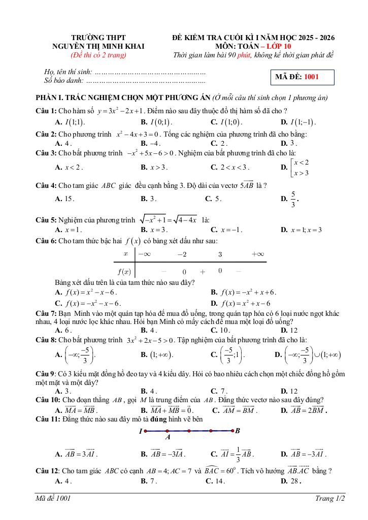 MonToan.com.vn giới thiệu đến quý thầy, cô giáo và các em học sinh đề kiểm tra cuối học kì 1 môn Toán 10 năm học 2025 – 2026 trường THPT Nguyễn Thị Minh Khai, tỉnh Hà Tĩnh. Đề thi có đáp án và hướng dẫn chấm điểm.