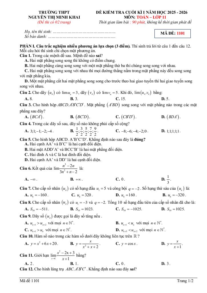Quý thầy cô và học sinh đang tham khảo đề cuối kì 1 toán 11 năm 2025 – 2026 trường thpt nguyễn thị minh khai – hà tĩnh, bộ đề thi được xây dựng bám sát chuẩn môn toán cập nhật nhất. Cấu trúc đề bảo đảm độ phủ kiến thức đồng đều, mức độ câu hỏi được cân chỉnh từ nhận biết đến vận dụng cao, phù hợp kiểm tra toàn diện năng lực. Hãy khai thác triệt để tài liệu này để đánh giá chính xác trình độ hiện tại và tối ưu chiến lược luyện thi của bạn.