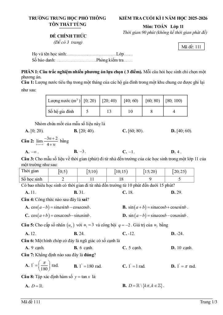Trích dẫn Đề cuối kì 1 Toán 11 năm 2025 – 2026 trường THPT Tôn Thất Tùng – Đà Nẵng: