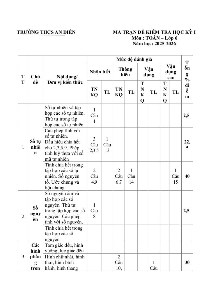 Trích dẫn Đề cuối kì 1 Toán 6 năm 2025 – 2026 trường THCS An Điền – TP HCM: