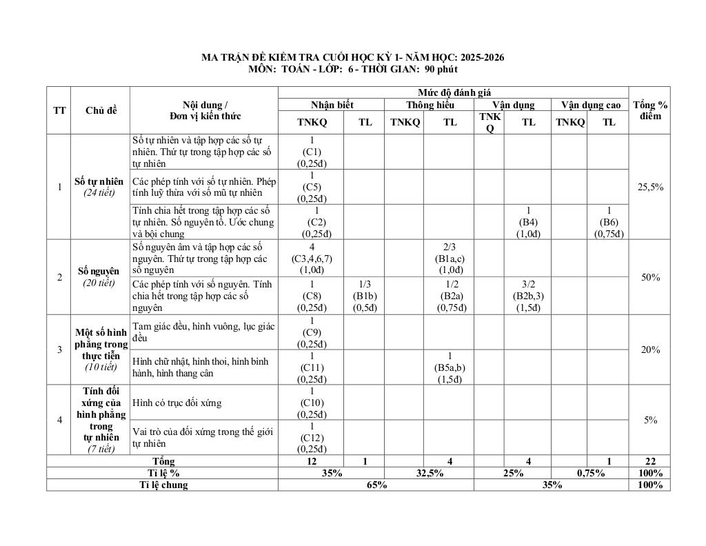 Ma trận Đề cuối kì 1 Toán 6 năm 2025 – 2026 trường THCS Huỳnh Thúc Kháng – Đà Nẵng: