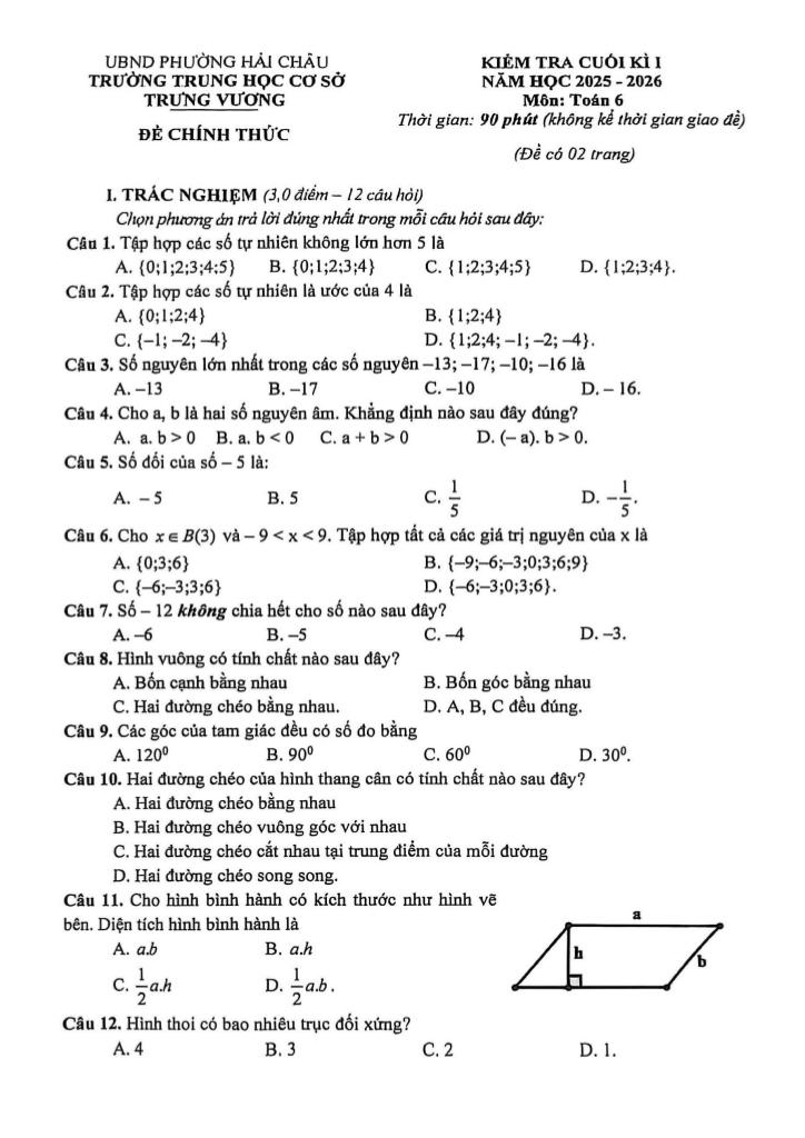 Trích dẫn Đề cuối kì 1 Toán 6 năm 2025 – 2026 trường THCS Trưng Vương – Đà Nẵng:
